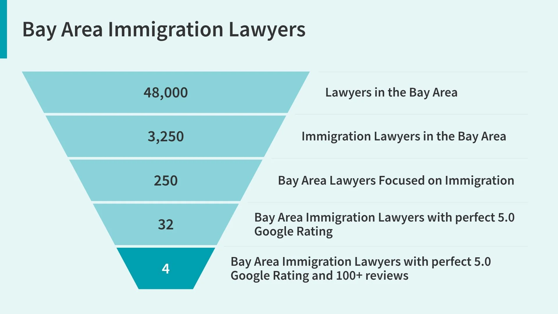 We estimate there are 250 immigration lawyers in the San Francisco Bay Area who have immigration law as their primary focus.